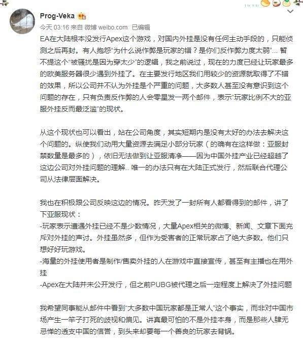 在文中他还提到了在积极和公司反映国内玩家的情况和亚服现状:第一,外挂虽然多,但作为受害者的正常玩家占了绝大多数,希望公司能看到“大多数中国玩家都是正常人”这个事实。第二,海量的外挂使用者是制作/售卖外挂的人在游戏中直接宣传,甚至有主播也在用外挂。第三,《Apex》在大陆并未公开发行,但之前PUBG被代理之后一定程度上解决了外挂问题。
