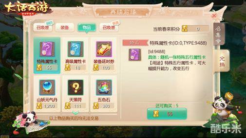 春来积分不仅可以用来兑换五色石、聚魄丹、龙之骨、玉符、高级属性卡等各种游戏道具,还能直接兑换萌宠小五叶和珍稀召唤兽山妖,还可以用于开启小五叶的技能格。使用抽奖券也有机会能够抽取到小五叶!万能的春来积分可以兑换海量好礼,赶紧行动起来,和自己的好友一起收集吧!