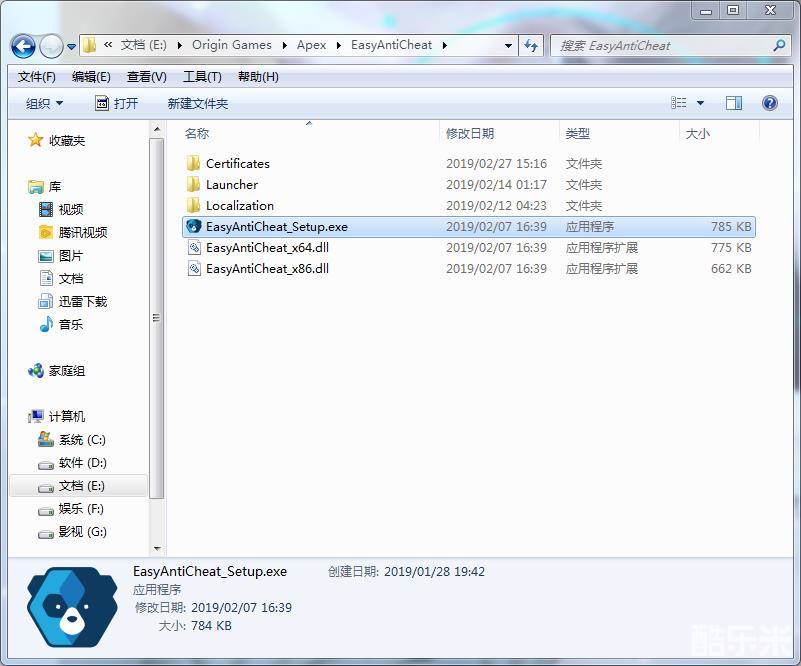 UP呢是安装在了E盘,我们关掉这个,自己打开到这个位置,点进APEX文件夹,找到名为EasyAntiCheat的文件夹,运行里面一个叫做EasyAntiCheat.exe的文件程序,这个呢是小蓝熊的修复程序↓