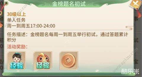 1、 周一到周五,每天的17:00-24:00,点击游戏界面的金榜题名图标即可参加。只要等级满足30级以上的玩家,都可以参与。