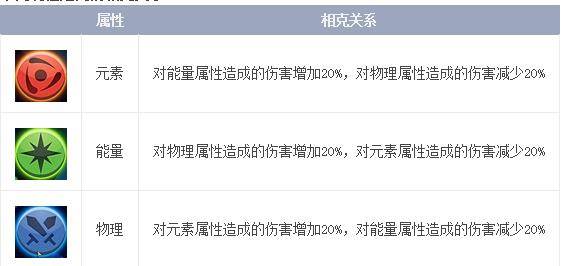 属性分为 元素(红色)>能量(绿色)>物理(蓝色)>元素(红色) 元素相克的伤害差值为20%.