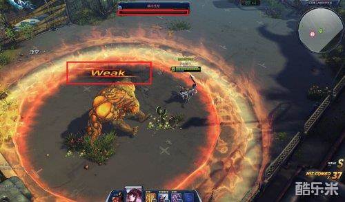 BOSS在释放一些特定技能后会进入weak状态. 头顶会显示粗体红色的警示字.此时攻击BOSS会使BOSS血条下的白条增长. 强控技能(例如:击退.浮空)会大幅度增加白条..当达到最大时,BOSS会进入眩晕状态,白条会减少至0 . 在减少的这一段时间内. 所有伤害为暴击.