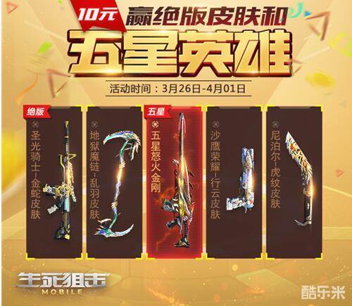 在3月26日至4月1日之间,《生死狙击》手游将会开启十元赢五星英雄的活动。在活动期间,玩家每充值100金币即可领取五星英雄宝箱一个,领取后可以自行前往仓库点击使用,在其中甚至可以开出永久的五星英雄级武器怒火金刚。