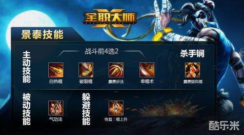 1、白热棍:景泰持续向前方攻击,使得对方的防御力在5秒内减少10%。施展技能后,使用移动、攻击技能的过程中可以进行取消。