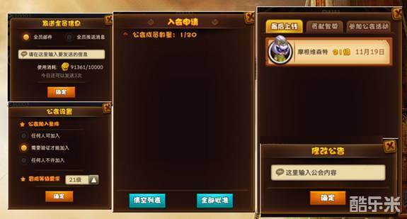 4、公会管理人员可进行发送信息、成员管理、入会申请批准、修改公告、公告设置、人员任命等操作。