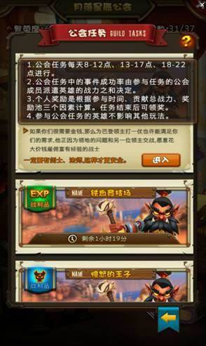 1、每天定时刷新的任务,公会成员可提交自己的英雄参加要塞任务,获取奖励。