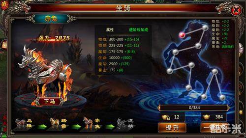 35级可以开启了坐骑功能,每次升级坐骑都可以提升战力,小编看了一下四阶不同的坐骑,还真实挺帅的,要是能骑个神圣的龙麟出街绝对可以吸引眼球。升级坐骑还可以看运气,每次升级可能会随机出现1.5倍,2倍,3倍;来个3倍经验就爽了!