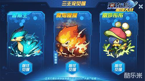 《赛尔号星球大战》开放元素三主宠觉醒后的精灵对应的分别是水系精灵鲁斯王,火系精灵魔焰猩猩以及草系精灵丽莎布布。玩家们通过游戏中即将上线的捐献任务来获得该系的觉醒能量,然后,消耗一定数量的该系觉醒能量就可以挑战boss,完成挑战目标后将可以完成三主宠的觉醒。三主宠觉醒后,保留原有天赋、性格、学习力,而且三主宠觉醒将在游戏中长期开放。
