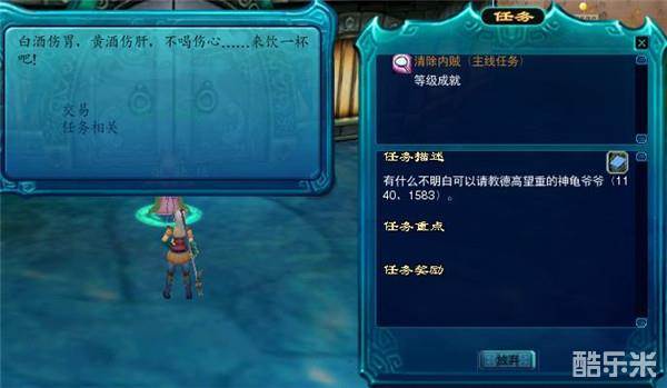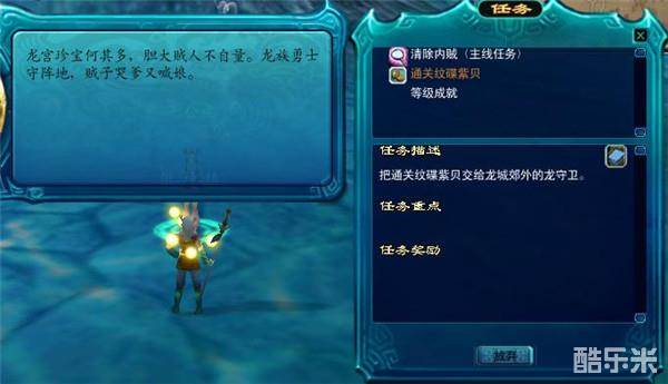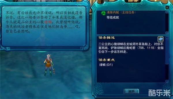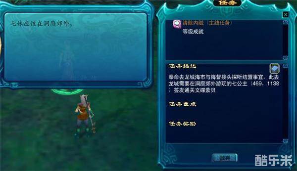 完成任务后,回到洞庭镇找到青蛇君,青蛇君首先会问我们一个问题,在这里选择长坚君,之后回到龙三少处完成任务。龙三少在感谢了我们之后,立刻让我们去龙城海市,不过在此之前我们需要在七公主处签发通关文碟。