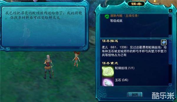 在蚌太太处我们终于得到了有用的消息,不过她需要我们去收集一些材料来完成接下来的任务,首先我们需要在洞庭镇找到柔儿并与之对话拿到丝线。