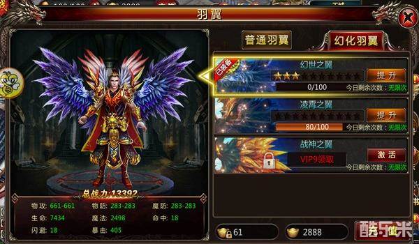 幻世之翼拥有大气紫色外观,能全方位增加属性,VIP5后激活。明显和前面四个羽翼不同档次呀,装上一个,增加战斗力变得更加明显。