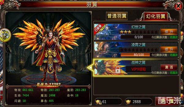 没错!第一名就是战神之翼,VIP9后激活。虽然增加全方位属性和提升方面与第二名一样,翅膀大范围跨度和黄金色搭配极具王者霸气,第一非它莫属。