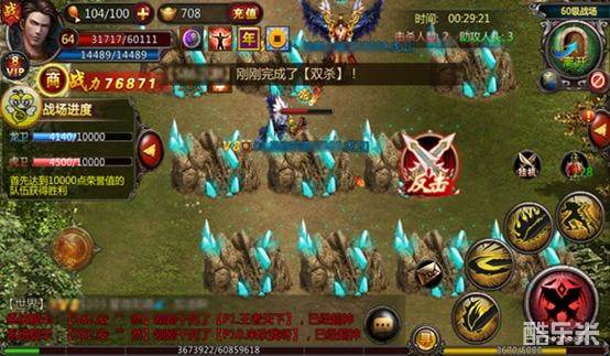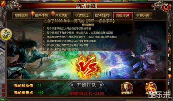 战场情况:跨服战场在全新地图上汇聚全服玩家一起战斗,划分为“龙卫”和“虎卫”两个对战阵营,玩家可以在里面体验到大规模实时团战、电竞、挖矿等元素,以在活动时间内收集荣誉点数量多的一方获得最终胜利。