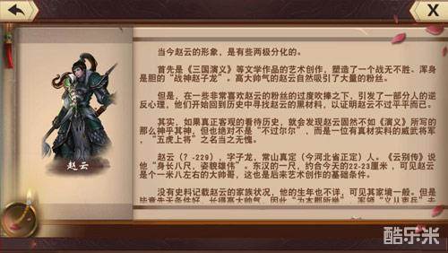 在其他的游戏当中,三国名将的介绍往往只是寥寥数笔,比如赵云:五虎上将之一等等,更有甚者甚至直接就拿这些名将开涮,很令人恶心。而《一骑当千2》中,每一个人物都有其传记,这些“传记”不单单引自《三国志》《三国演义》等,还有北京大学学者的言论,从真实的角度赋予人物真实的评价,比如争论较多的吕绮玲,也并未说此人就真的存在,或者此人根本就不存在,而是以一个较为委婉的方式来论述其存在的理由,这就上升了不少高度,正所谓“吃水不忘挖井人”,虽然消费了一些三国,但总的来说还是良心大大的,因此笔者将这个传记部分拿到了最前面来说。