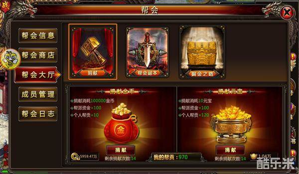 捐献金币:每次捐献10万金币获得10点帮贡,最多捐15次,消耗150万金币得150点。