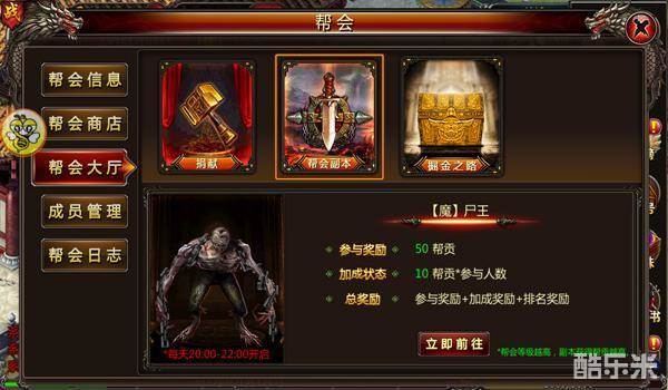 帮会副本副本在每天20点-22点开启,参加1次会得50帮贡左右,都是帮会成员一同去战斗,大家一起努力一下就把BOSS给打趴。
