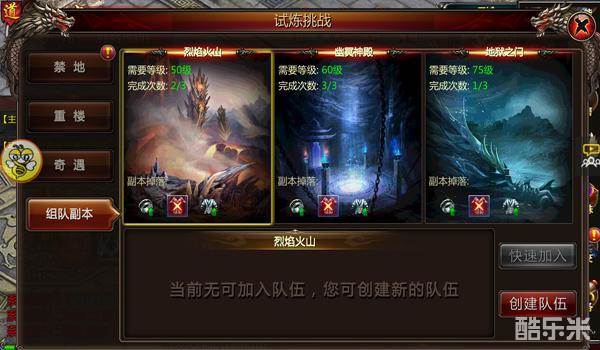 小编在此先跟大家分享一下挑战组队副本的一下心得,帮助大家方便收获神兵碎片。首先组队副本有三个,分别是烈焰火山(50级)、幽冥神殿(60级)、地狱之门(75级)。