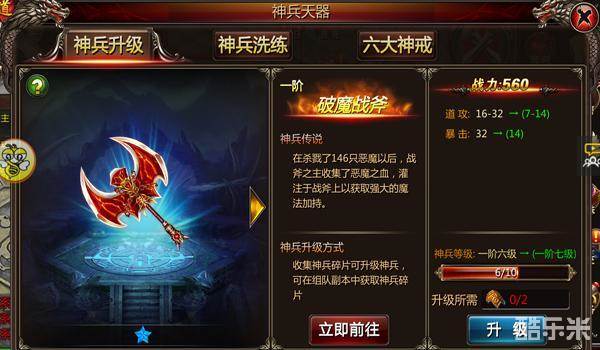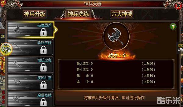 在我们50级左右并开放“神兵天器”功能后就会拥有神兵系统,初始开放一把“破魔战斧”的神兵,不过要想升级和开放更多神兵,那么我们必须去挑战组队副本。