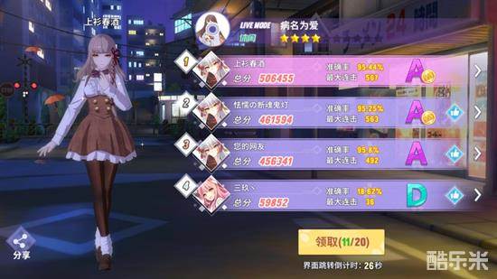 另外,靠副歌高潮部分前爆,有首歌就是开头全是长按,到第一个过渡跳舞部分已经70%,后面全是单点的,三分之二的歌全单点。还有几首是结尾的,快结束的时候双长按或者有首是单超级长按,能从爆气开头按到结尾。