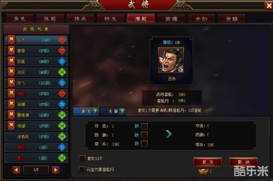 5. 武将潜能:消耗一定的潜能丹对武将潜能进行激发,如果不想激发某个属性可进行勾选即可