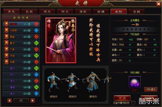 7. 武将升阶:武将消耗一定的升阶丹(对多余的武将碎片进行熔炼获得)可进行升阶操作,升阶后武将属性将会有一定增加