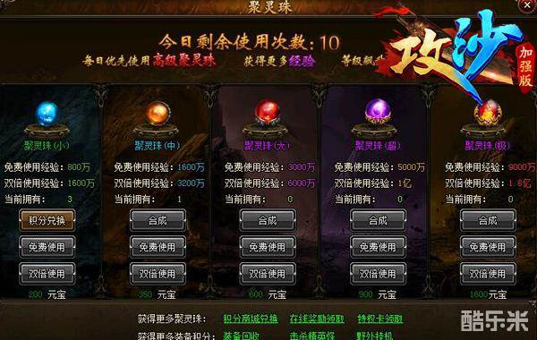 《攻沙》中聚灵珠分为5个档次:小、中、大、超、极。由于每天每个玩家仅能使用10次聚灵珠,因此越高级的珠子使用性价比就越高。所以建议玩家每天这么做: