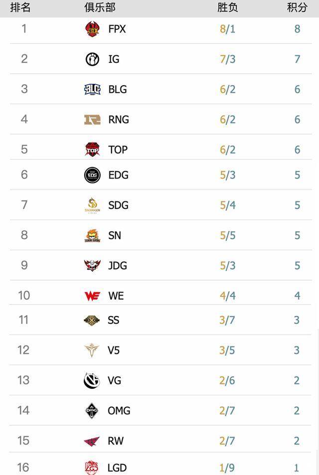 唉其实现在LPL就是分成了三个阶段的队伍,力争前四...不是应该说是这样子,力争四强甚至是夺冠的队伍,FPX、IG、TOP、RNG、EDG,BLG其实他们排名是属于这个范围内的,但是BLG现在没有遇到真正的强队,然后想要进季后赛或者说想要争取一个季后赛好席位的队伍,其实就是从BLG这里开始,包括BLG啊、JDG啊后面的队伍SDG、SN、WE、V5、SS,其实V5和SS的战绩特别是SS的战绩已经有点掉队了。