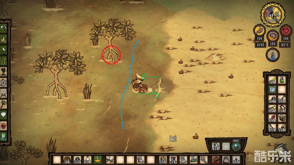 如图,在红树林区域躲陨石,但是一定要在离岸边较近的地方,原因有以下几点: