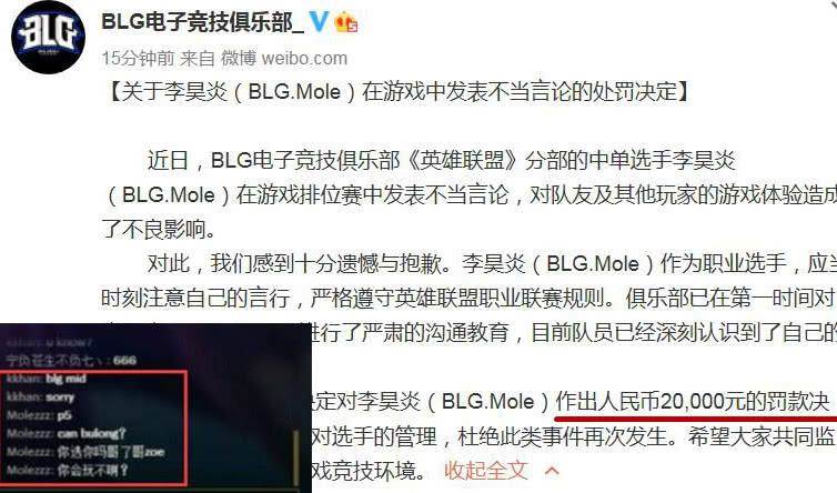 在这件事传出之后,网友都很愤怒,造成了很大的影响。最后BLG俱乐部发出公告,表示Mole在游戏中发表不当言论,因此罚款两万元!