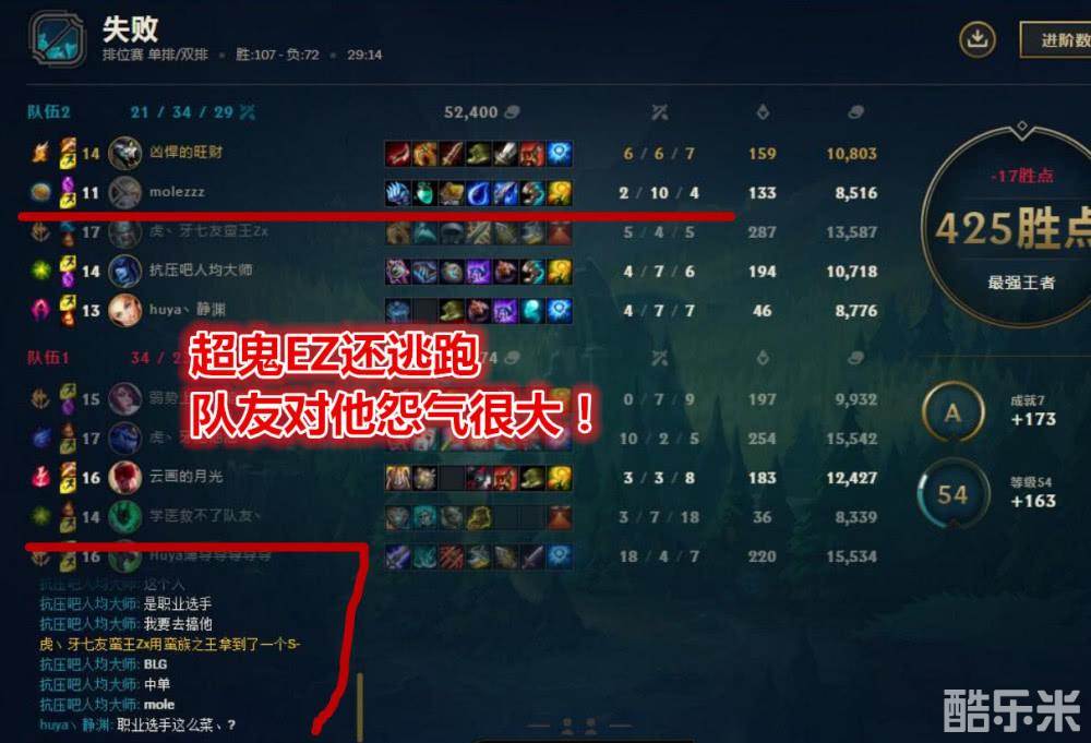根据爆料网友所说,Mole的EZ在排位中发挥很不正常。比如打野盲僧游下,光辉疯狂打信号弹叫他撤退,他却不肯走,还要直接E脸送人头。光辉一直在劝Mole好好打,他却不听话。游戏后期Mole的EZ跟队友说了一句“肚子疼你们玩”,然后就在泉水里挂机了。