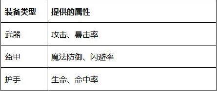 武器、盔甲、护手、靴子,每种装备提供的属性不同。