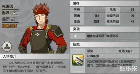 艾恩葛朗特中的上层玩家,也是攻略组的一员,克莱因自然是橙色品质的英雄啦~克莱因双手持刀蓄力重击单体敌人,造成伤害,并为自己增加免疫负面BUFF的状态持续N个回合。并有几率击倒敌人,且对倒地的敌人在成额外伤害。并且技能罗刹因为武器注入武斗意志,试图斩杀一名敌人,目标损失的生命越多,则此技能造成的伤害越高。