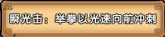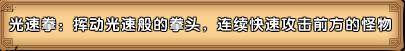 这招不用多说了吧,连击率贼6贼6的,LZ我估计连击20下,很屌很屌的,特6特6的这招我感觉是克制闪避类的BOSS,例如大鹏(可是他不会飞)或者白猿,这两个闪避都是比较高的,所以说非常建议大家用光速猴去打白猿,那样胜利的几率很大