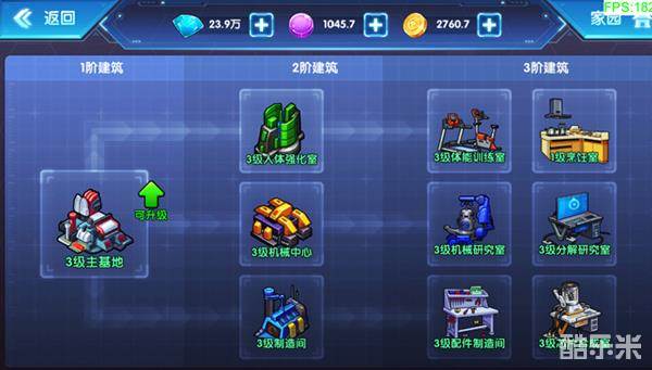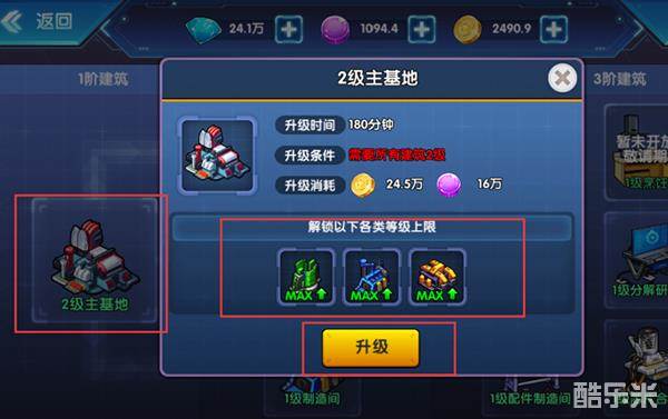 主基地升级后可以使人体强化室、机械中心、制造间的等级上限提升