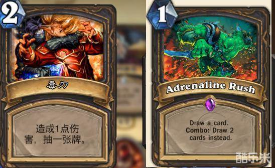 原本为了凸显魔兽中盗贼敏捷的特点,炉石传说设计师原本是将抽更多卡以及连击作为早期盗贼的设计蓝图,因此诞生了一张1费抽1张卡牌,连击抽2的“肾上腺素”。但是由于在实战之中过于强大的过牌能力,最终被设计成了目前的毒刃法术(固定打1抽1)。