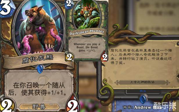 而如果说要回归的话,暗矛猎人这张被删除卡无疑是回归最成功的一张。其特效每当你召唤一个野兽,便使它获得+1/+1。而在上古之神的低语版本中,德鲁伊一张“腐化灰熊”卡牌就做出了近似的效果“每当你召唤一个随从,便使它获得+1/+1”。并且在卡牌描述中放出一个彩蛋:腐化灰熊袭击过一个猎人,使得它转行做了演员!这个猎人应该就是测试阶段被删除的暗矛猎人了。