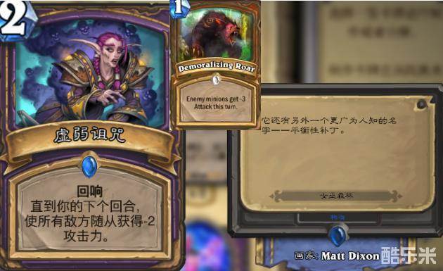 而另一张被删除的德鲁伊专属法术“挫志咆哮”在女巫森林中以另一种形式走向了回归,原本效果为“使敌方随从本回合内攻击力-3”现在则变成了术士的回响卡“虚弱诅咒”直到你的下个回合,使所有敌方随从获得-2攻击力。而除了这些