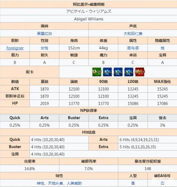 atk在ssr(五星从者)中排名正数第12,与葛饰北斋并列。hp排名中等。基础属性属于阿比的长项。