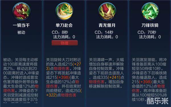 被动技能“一骑当千”,关羽每主动移动100距离速度将提高2%,移动达到2000距离时将进入冲锋状态.冲锋时对敌人造成普攻伤害并附 带自身最大生命值12%的物理伤害.该姿态下关羽受到减速或者控制导致其速度低于375时.将停止冲锋。冲锋姿态普攻可击退敌人,面朝 敌方将获得20%移动加速。此技能是关羽所有技能运转的核心,面向敌人还能增加自身移动速度,因为需要移动达到2000的距离才能进入 冲锋状态,所以关羽常常游走是非常有必要的,还有便是尽量避免关羽被减速或控制,因为无法进入冲锋状态的关羽基本已经废掉了。