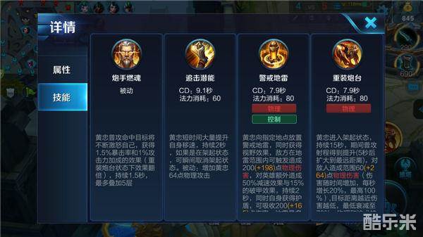 黄忠短时间内提升大量移速,持续一段时间,如果在架起状态,可以随时取消架起状态,此技能可以作为一个逃生技能使用,但时间过短,效果不明显。