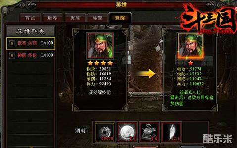 在51《斗三国》中,当你的红色武将达到4星100级时,就可激活觉醒,此时红色武将将会觉醒成暗金英雄。不仅外形变得更为拉风,各项属性也会有大幅度的提升,同时觉醒武将还会获得一个新的觉醒技能,很黄很暴力呦。觉醒后的武将只是初阶,后续还可继续进阶到最高的五阶。