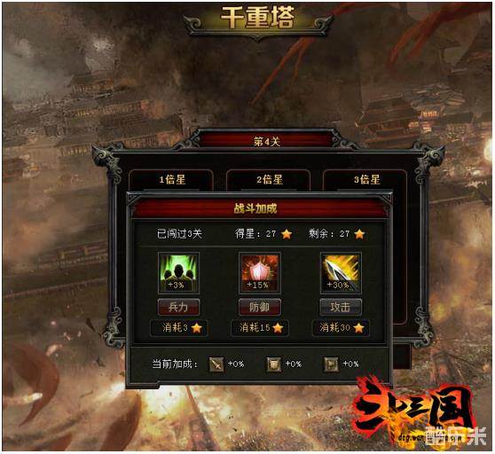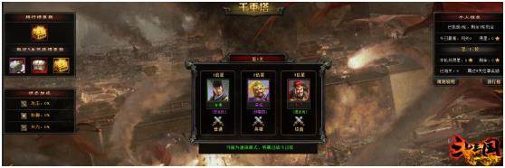 千重塔的位置位于演武堂旁边,玩家每天三次闯塔,爱六娃《斗三国》千重塔不仅仅是一个斗智斗勇的闯关,更能让各位主公了解自己麾下军团的极限,更清楚的了解自己的实力方能调整各文臣武将的天赋培养方向。闯关结束后,系统自动取3次闯关中最高成绩排名。攻打过程中每3关会有一次属性提升,第一次攻打时每5关可获得一次奖励,玩家进入千层塔排行榜还可获得额外的金币奖励。