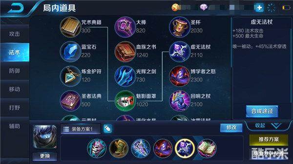 痛苦面具的属性非常适合扁鹊,同时被动折磨配合他的被动让他的消耗和伤害水平有所提升。影忍之足能够增加他在前期的生存能力。冰痕之握增加最大生命、物理防御、冷却缩减和最大法力,被动能够造成范围减速,提升扁鹊的粘人和生存能力。博学者之怒增加大量法术攻击,能够大幅提升扁鹊大招的爆发伤害。虚无法杖让他拥有很高的法术穿透,即使遇到坦克时不会特别吃力。贤者之书增加大量法术攻击的同时被动也能够增加大量生命值,提升扁鹊的整体输出与生存能力。