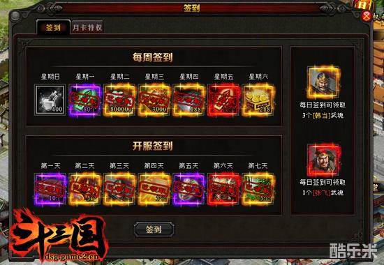 玩家每天签到都可以得到一个张飞将魂和一个韩当将魂,积累到一定的数量即可合出英雄。