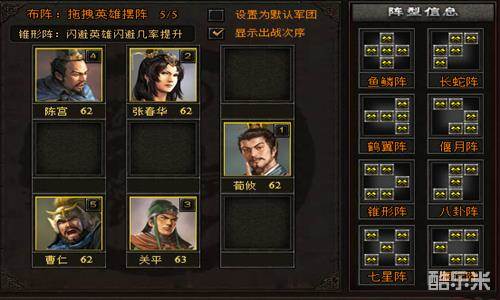 中期武将阵容推荐:3星荀攸、3星陈宫、3星张春华、3星关平、2星曹仁。推荐阵法:锥形阵(闪避阵)