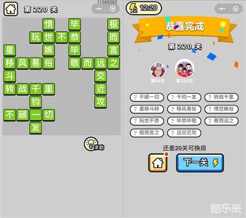 《成语升官记》探花第220关通过以后就可以再次升官,从探花变为榜眼,所以可想而知这一关还是会创造一点难度,下面就是小编为大家整理好的成语,大家可以参考直接快速通关!