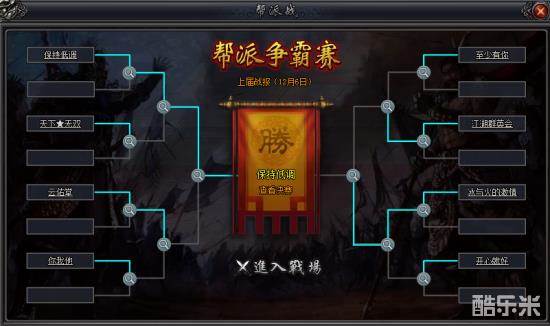 帮派战中分为:击杀旗帜、击杀敌方玩家,任何一方将敌方旗帜击杀完毕,则胜利。分别进行八强赛、四强赛、半决赛、决赛,战斗中途休息2分钟,帮 派战期间不可进行以下操作:创建帮派、申请入帮、批准加入、拒绝加入、提出帮派、职位变更、解散帮派、退出帮派、捐献黄金、招人公告。