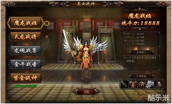 在战神系统中,共有五位美女战神等待您的召唤:“魔龙战姬”、“天龙战将”、“龙魂战尊”、“金牛战圣”、“紫金战神”,战神等级越高战斗力越高。