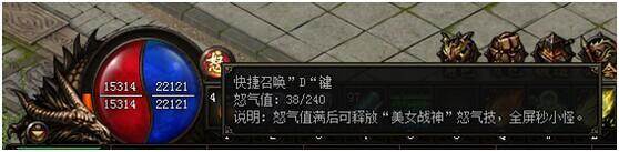 战神在打怪的过程中,能够积攒“怒气”,当“怒气值”满后可释放怒气技,秒杀全屏小怪。