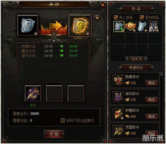 升级灵器需要消耗“灵器碎片”和金币,“灵器碎片”可以在限购商城中用礼券购买。